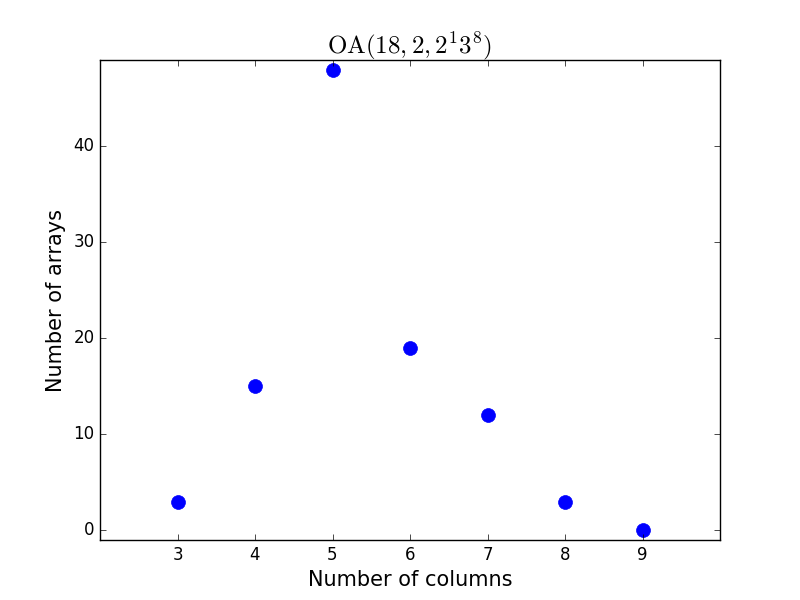 | OA(18; 2; 2137) | 3 | 1.00,0.00,0.00,28.00,52.50,52.50,70.00,33.00,6.00 (3 arrays) |